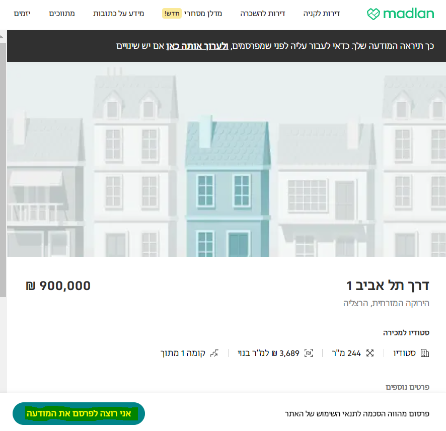 ניתן לעבור לקישור הישיר להעלאת מודעה: https://www.madlan.co.il/upload-bulletin