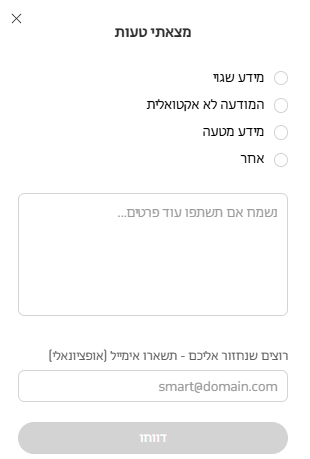 במקרים שונים תוכלו לדווח לנו על שגיאות/חוסרים במידע שמוצג באתר מדלן