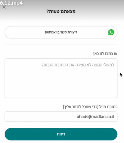 לוחצים על "ליצירת קשר בווטסאפ" או כותבים את הטעות/החוסר שמצאתם בתיבת הטקסט ומצרפים כתובת מייל: