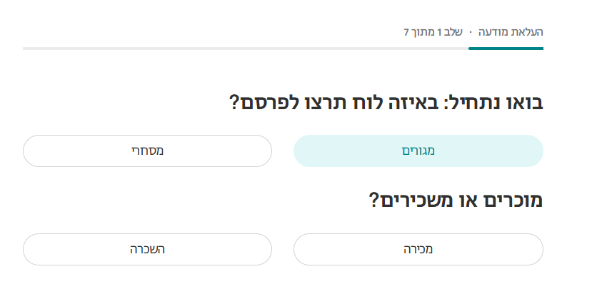 2.2 לאחר לחיצה על "העלאת מודעה", יפתח דף פרסום מודעה, יש ללחוץ על "מגורים":