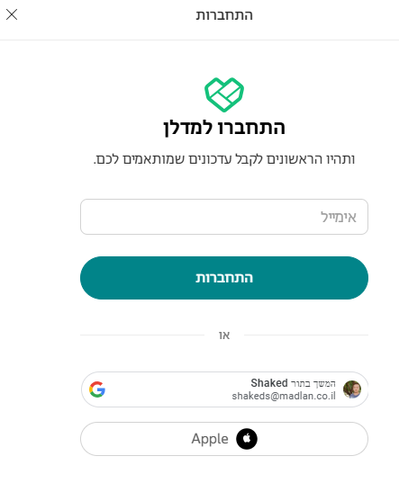 תוכלו לבצע שוב התחברות לחשבון בדרך המועדפת עליכם(מייל+סיסמה, GMAIL או APPLE)