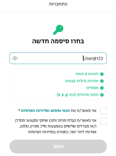 5. צרו סיסמה חזקה. הסיסמה צריכה להיות עם אותיות קטנות, גדולות, מספרים ותווים מיוחדים.