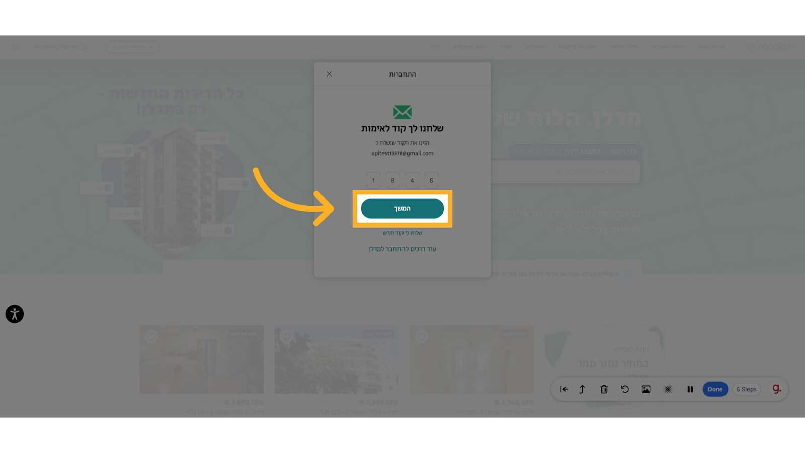 יש להזין את הקוד שקיבלנו במייל וללחוץ על "המשך"