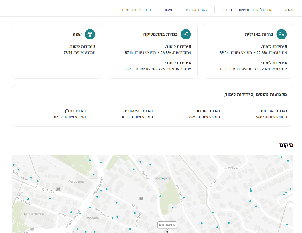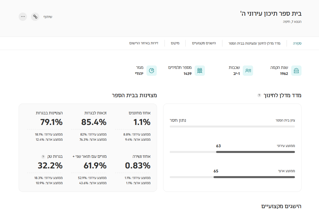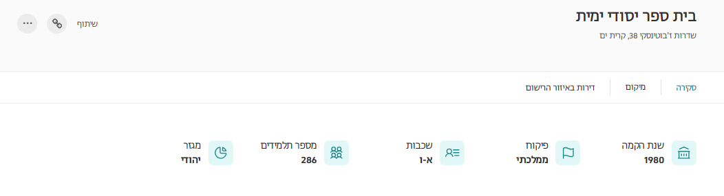 תוכלו לעיין בפרטים הזמינים על אותו בית ספר, למשל שנת הקמה, מס' תלמידים ועוד. אפשר גם לשתף את הממצאים במייל, פייסבוק ועוד.