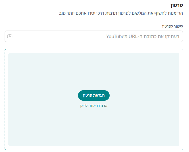 אנו ממליצים להעלות את הסרטון ליוטיוב ולהדביק כאן את הקישור. זה מבטיח שהסרטון ירוץ מהר וחלק לכל הלקוחות, גם בנייד.